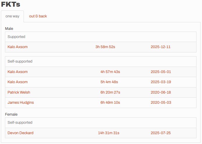 - Kalo Axsom also holds the self-supported out & back record of 11 hr 40m and 54 seconds from May 1st, 2025, beating the previous record of 15 hr 17 min 35 seconds set by Patrick Welsh in June 2020.