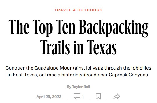 The Top Ten Backpacking Trails in Texas in April 2022. This list of Texas’s best backpacking trails by Taylor Bell from Texas Monthly includes the TBTL.