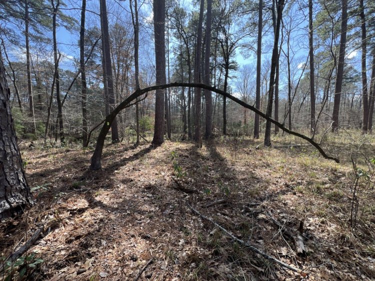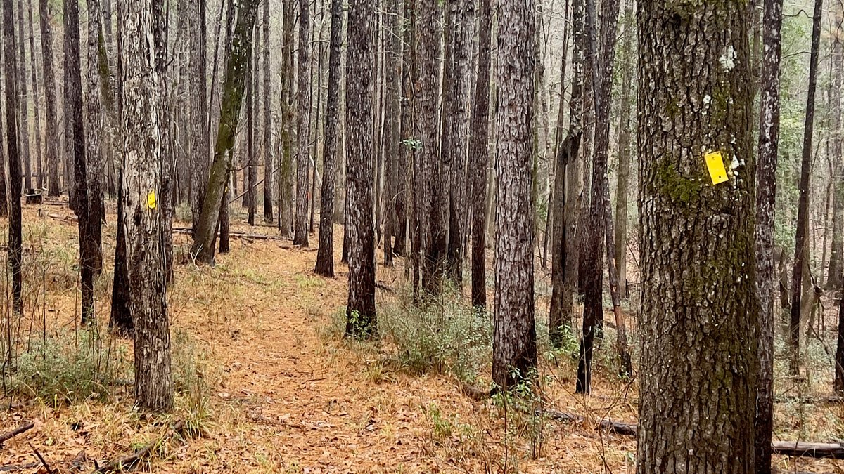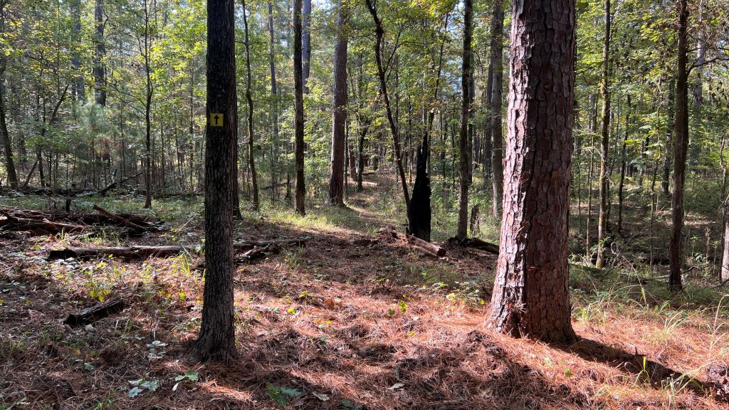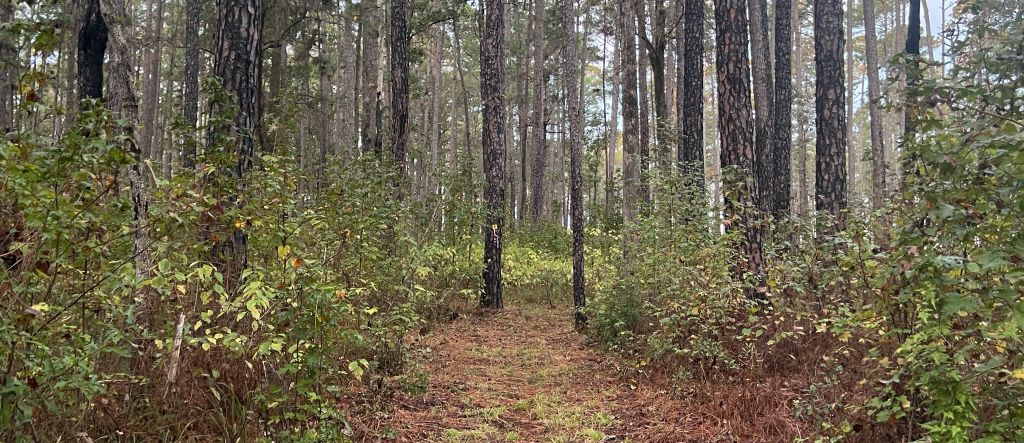 - The S. Moore Plantation Hunter Camp is located off Forest Road 114 on the road labelled 1296 on the map (a little south of where the camp icon is on Avenza). This is another large site, and the Forest Service Interactive Visitor Map shows that road 1296 leads to the trail. There is no evidence of a forest road crossing the trail as per the map, but an old road crosses further south, closer to Little Creek.