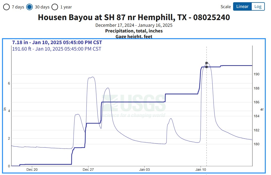 - The nearest water gauge is on Housen Bayou at SH87 near Hemphill. This is a good estimate for localized rainfall. However, TBTL creek levels rise and drop faster than Housen Bayou during and after rains. Just before this hike in January 2025, Little Creek (mile 23.5) rose ten feet and burst its banks after two inches of overnight rain, but was just knee-deep twelve hours later. Little Creek and Walnut Creek (mile 13.4) are the largest creeks on the trail. Reports suggest that Little Creek was knee-deep when this gauge was 181ft, and able to be crossed dry when this gauge was at 178ft.