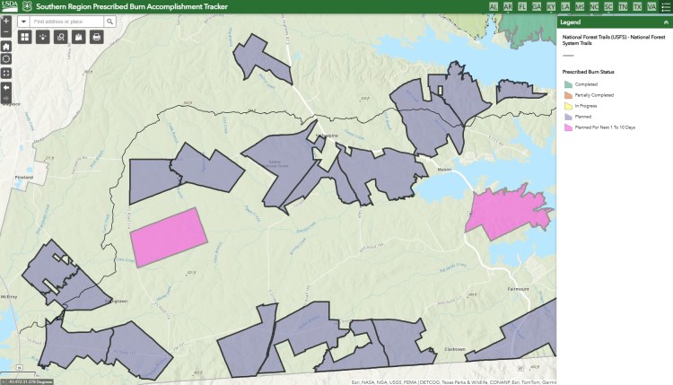 This “Southern Region Prescribed Burn Accomplishment Tracker” shows the prescribed burn plan for the Southern USA, with the link zoomed into the TBTL area. The picture shows the map from April 2025. To show the trail on the online map, you add the “National Forest Trails (USFS)” map layer.