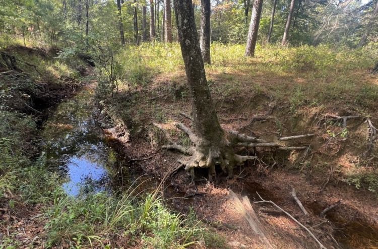 The same location as above, but 12 hours after 2 inches of rain. Looking at the tree roots, the water appears to be about a foot deeper. Using these pictures, the water level with respect to the tree roots can be used as a local water gauge.