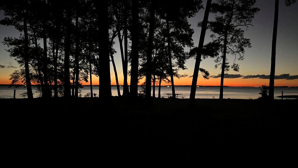 The same location as above, but during a drought in October 2025. The picture shows a log in the direct below the tree, which makes the water shallower when it is underwater, but you can’t normally see it!
